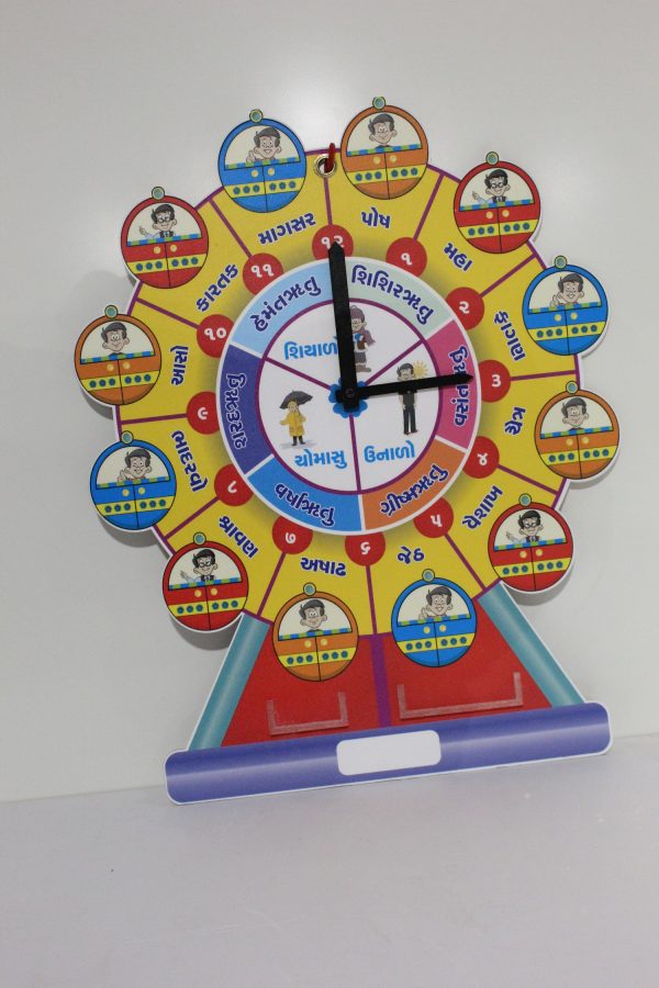 2.8mm Thick Poly Proplyn Structure Sheet with Digital Vinyl Print along with Educational Features Of : Gujarati Months / Season & Time with Wooden Kids Clock Hands on Multicoloured Printed Gloss Laminated Card Set Unit with Packing Box ( Size : 375mm X 300mm X 2.8mm )
