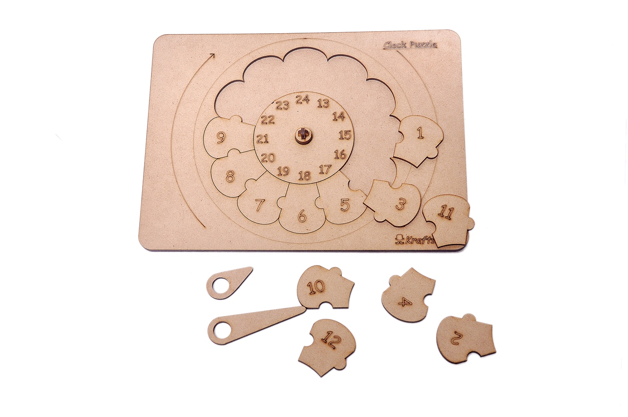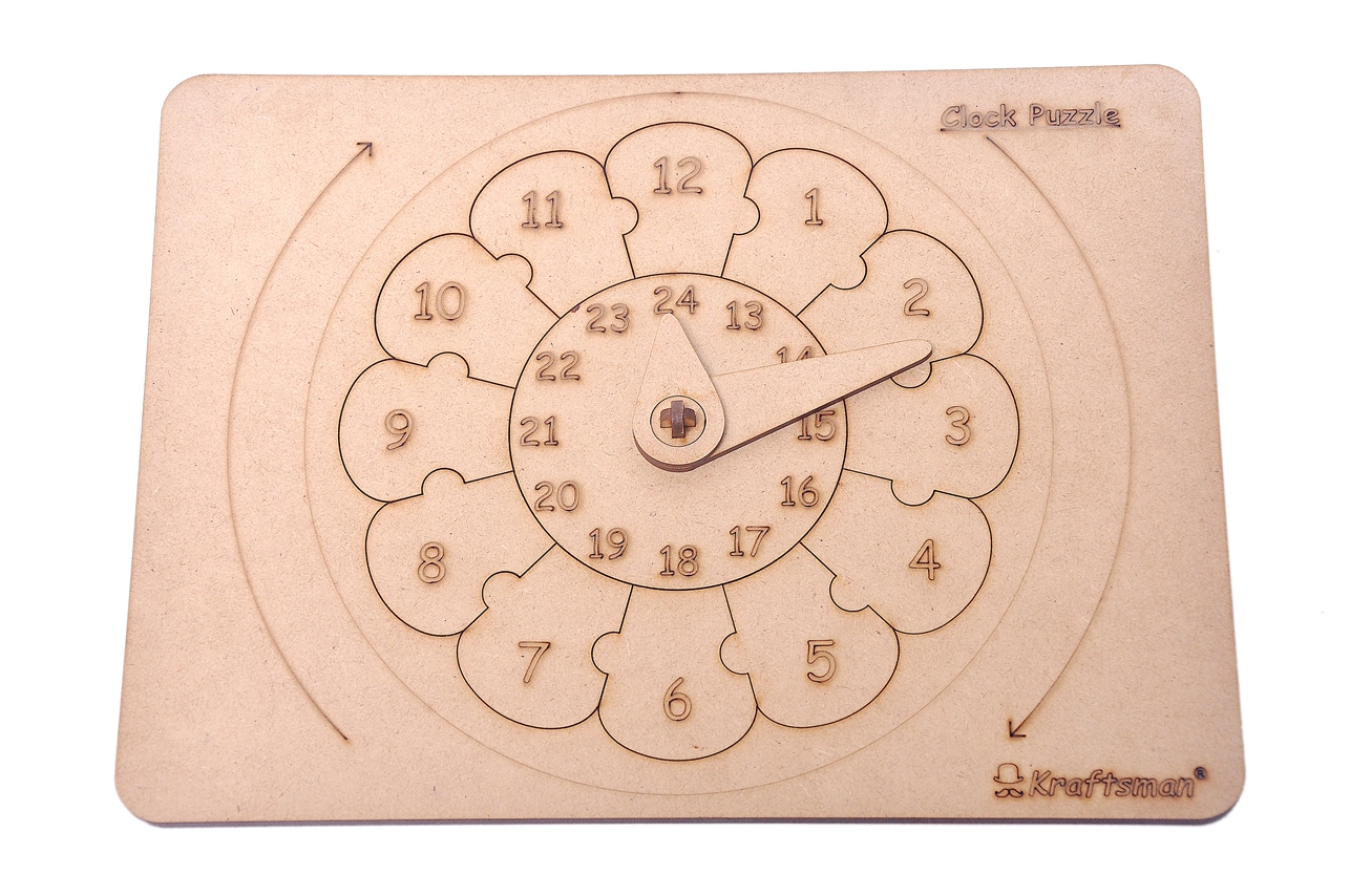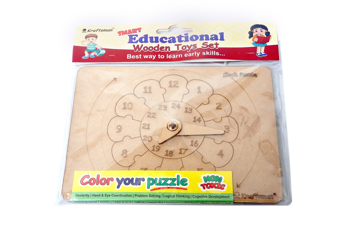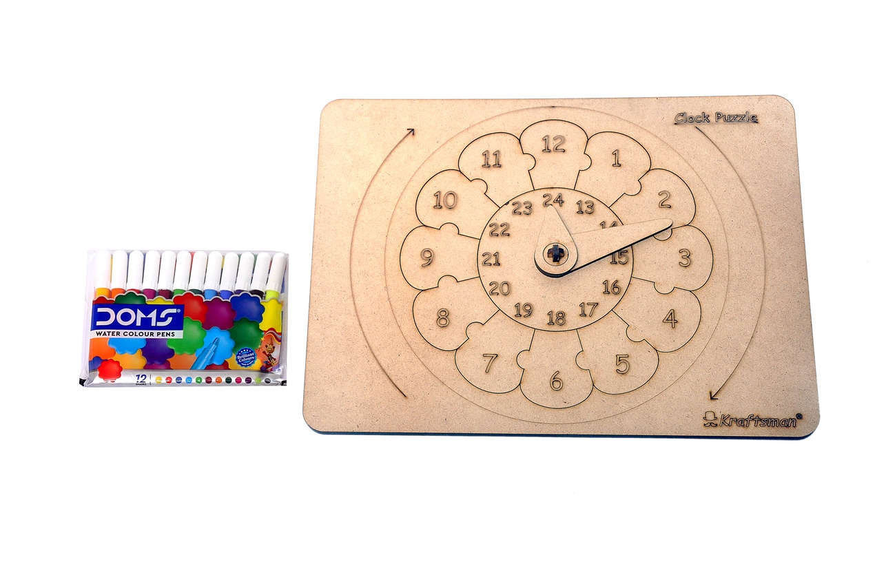 The board has the clock numbers as cutouts as puzzle pieces and Minute and Hour hands also rotate in either direction. Help your kids to learn the entire clock system easily and quickly with our fun activities puzzle boards.nThe sketch colors are also provided along with the pack of the puzzle boards. So help your kids to learn and identify the objects and also to color them with their own imagination.nOpens in a new windowMade up of Engineered woodnMinute and hour hands rotate in both directions.n24 hours format clock system.nKids can color the puzzle pieces and play forever.nSketch pen color set included.